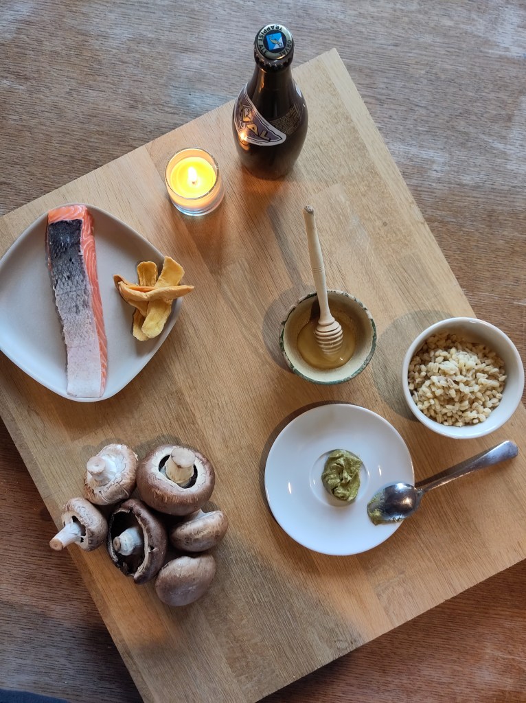 Cet Orval jeune s’apparie délicieusement avec ce saumon braisé, couvert d’une sauce miel-citron-moutarde. L’ensemble se laisse merveilleusement accompagner par des champignons à la poêle et de l’orge mondé agrémenté de thym et de basilic.